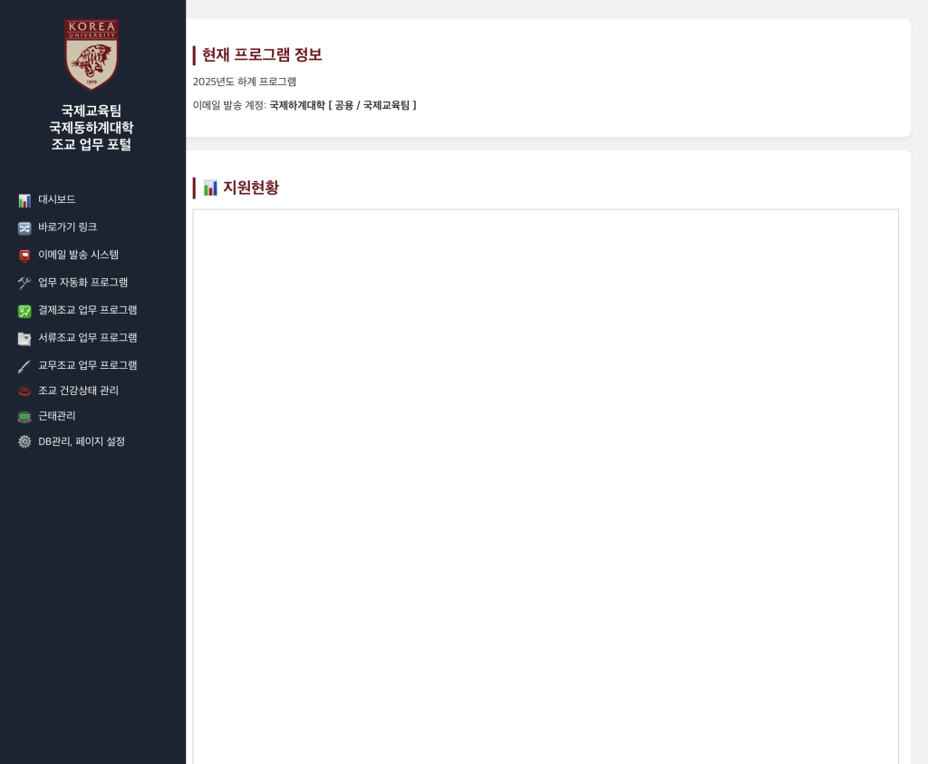 고려대학교 국제하계대학 조교 포털은 프로그램 운영을 맡은 조교들의 업무 효율성을 극대화하기 위해 구축된 통합 관리 시스템입니다. 이 포털을 통해 조교들은 개별 프로그램에 대한 신청, 배정, 일정 확인, 업무 보고를 하나의 플랫폼에서 간편하게 처리할 수 있습니다. 관리자는 조교들의 업무 현황을 실시간으로 파악하고, 업무 분장을 일괄 배정하거나 개별적으로 조정할 수 있습니다. 모든 업무 기록은 자동으로 저장되어 누락 없이 정리되며, 별도의 보고서 작성 없이도 전체 운영 상황을 한눈에 확인할 수 있도록 설계되었습니다. 또한 다중 사용자 환경에 최적화된 구조로, 조교와 관리자 간의 원활한 커뮤니케이션을 돕는 기능도 함께 포함되어 있습니다.